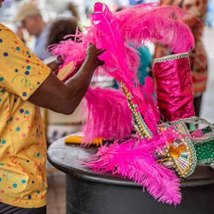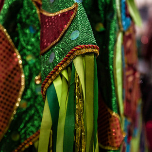 We walk up to the third floor, which weaves around openings that allow the floats to pop up through. The workers are seeing costumes and again, we aren’t allowed to take photos of anything for this year’s parade. We do get to take photos of previous years’ costumes, and I snap away at the feather, glitter and sequin covered masterpieces. I am fascinated to learn that everyone who works here gets paid, with the money coming from sponsors. Getting ready for the parade is a year long process - right after Carnaval, they start planning next year’s parade. I can see why - the story, the floats, the costumes, the dancing, the singing….. I don’t know how they do it!